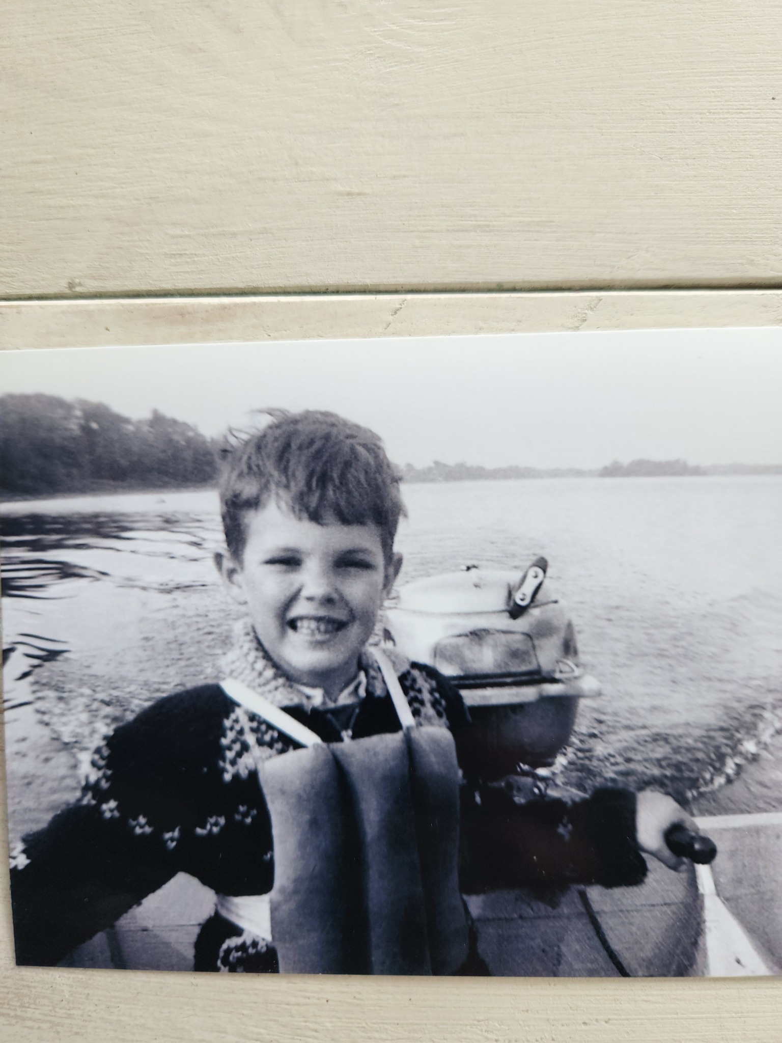 At the helm of a boat named Bottle with a 2 1/2 hp Johnson. The fondest memories of my life grew from summer months learning to be a happy kid in the widening of the Trent River known as Katchewanooka Lake. It was full of weeds, lilly pads and wild rice; frogs, snapping turtles and water snakes. Me and my two cousins, Chris and Hugh - now my best friends - explored every inch of the fabulous and now non-existent paradise and loved every minute of every summer month.